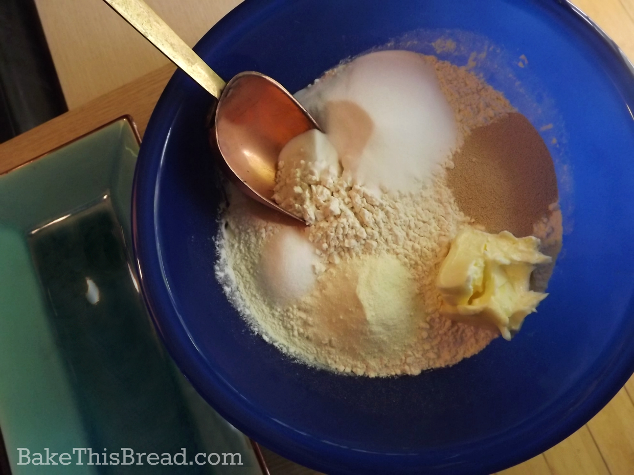 Deposit your mix of dry ingredients and butter into the bread machine. There no need to mix the ingredients. Just slide in the whole gathered bowl of fixin’s.